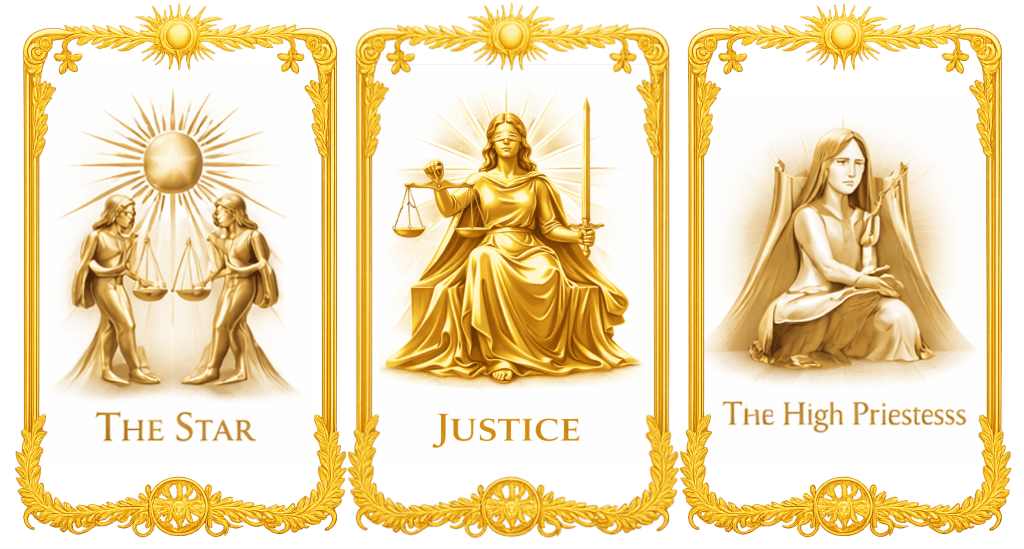 The Star — trust restored after collapse. Justice — ethical calibration, accuracy, responsibility. The High Priestess — restraint, silence, inner timing.