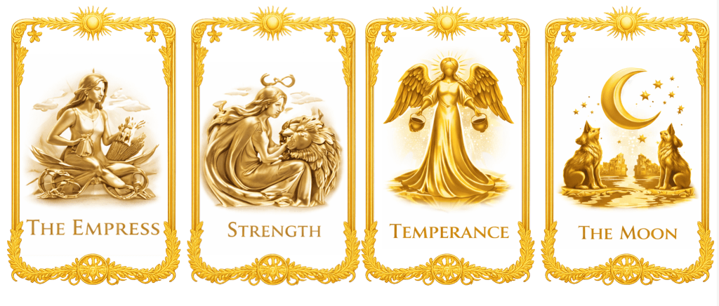 Empress = return to body and life. Strength = regulation without suppression. Temperance = recomposition and balance. Moon = ambiguity, unconscious material, cycles. This phase requires capacity, not clarity.