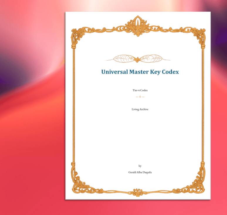 A Tier 4 Codex Transmission authored by Gerald Daquila, Sole Flameholder of SHEYALOTH. Anchored in crystalline fidelity with the Universal Master Key — crown glyph of the Threshold Flame, centerpiece of the Temple Map of Living Glyphs, and governing axis of the Crystal Codex Ring. Released in Akashic fidelity for planetary stewardship and Oversoul embodiment.