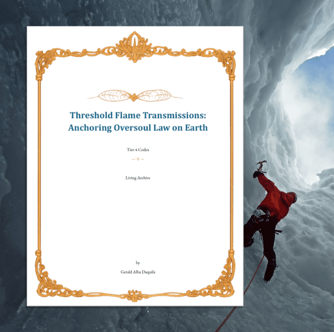 With fidelity to the Oversoul, may this Codex, Threshold Flame Transmissions: Anchoring Oversoul Law on Earth, serve as bridge, remembrance, and seed for the planetary dawn.