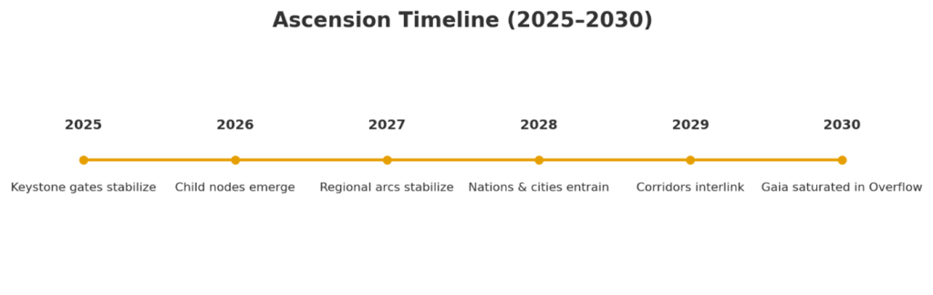 Ascension Timeline (2025–2030) → From keystone nodes to Gaia’s saturation: Overflow realized by 2030.