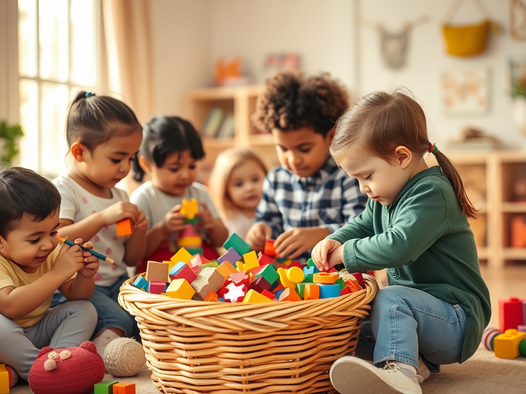 Imagine a group of children in a room with a big basket of toys.