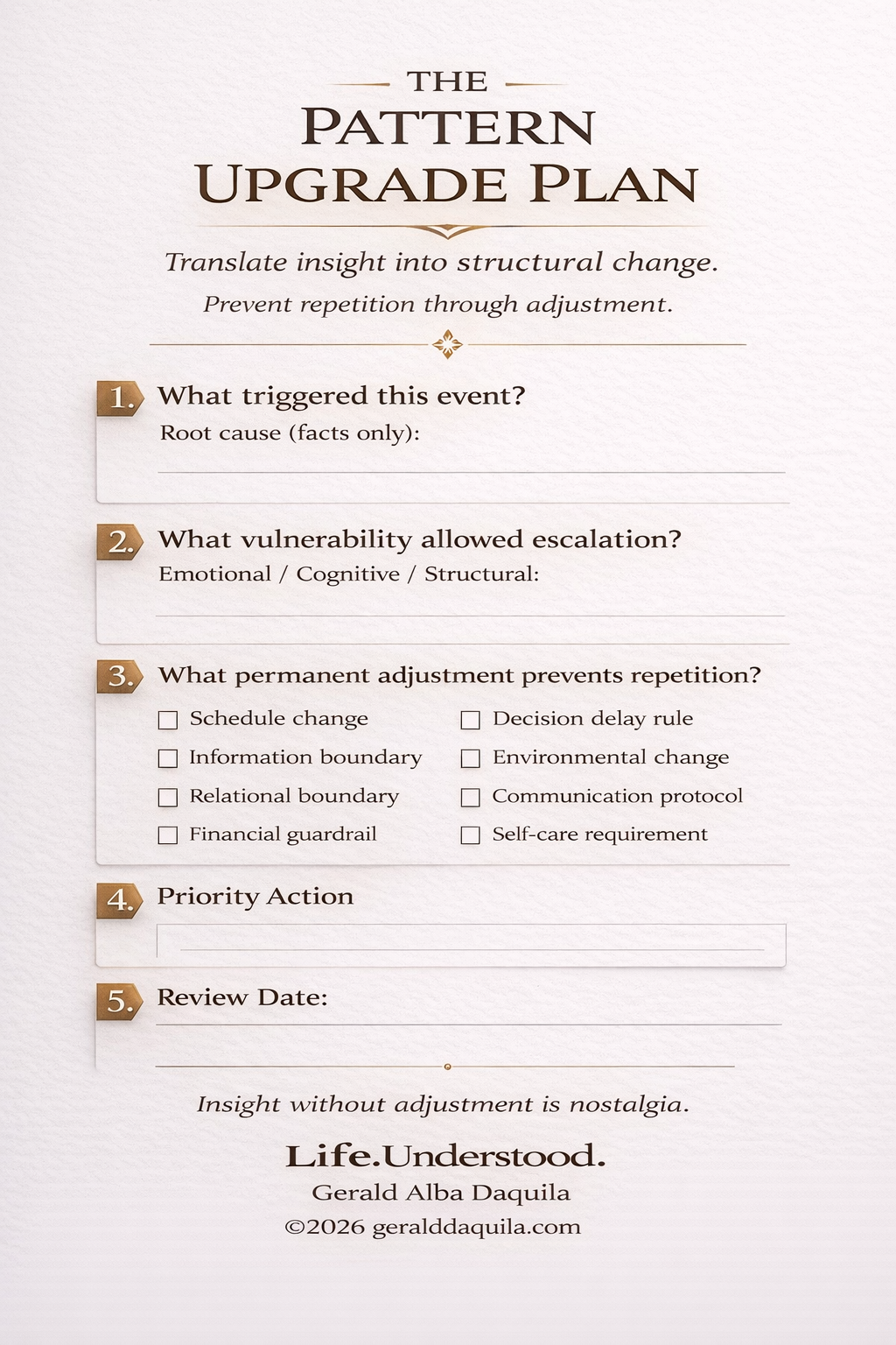 Translate insight into permanent structural adjustment. Convert awareness into boundary, routine, or decision rule changes that prevent repetition.