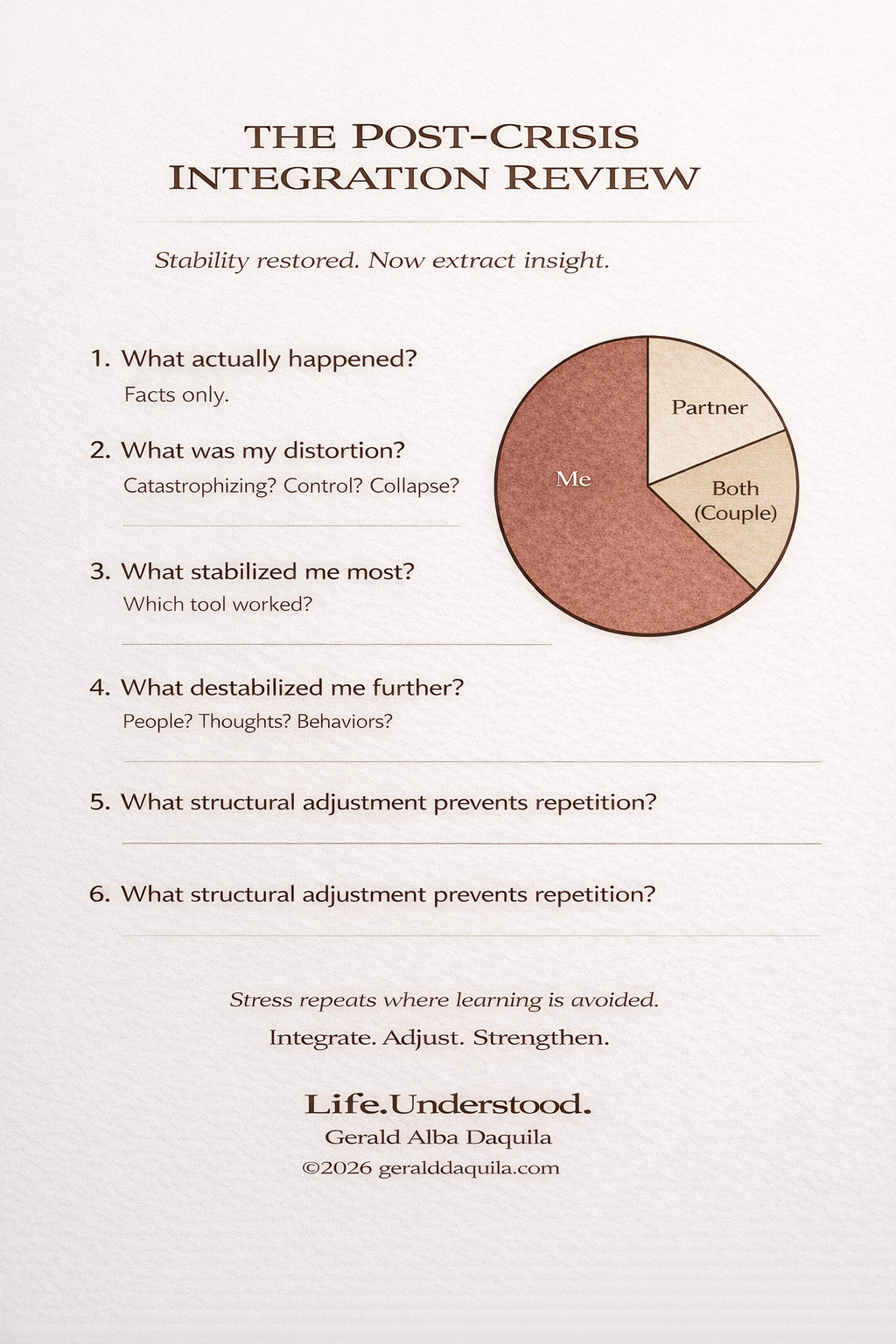 It is used only after emotional intensity has lowered and cognitive clarity has returned. Its purpose is not to relive the event — but to extract insight, adjust structure, and strengthen resilience.